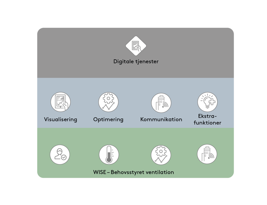 WISE indeholder altid en basispakke, som gør det muligt at opnå et behovsstyret indeklima. Ud over grundpakken kan der tilføjes en række løsninger, som f.eks. visualisering, optimering, kommunikation og diverse funktionaliteter. Udover dette kan der også tilføjes en række digitale tjenester: