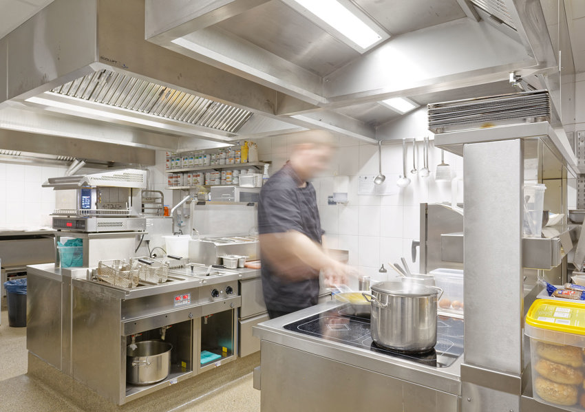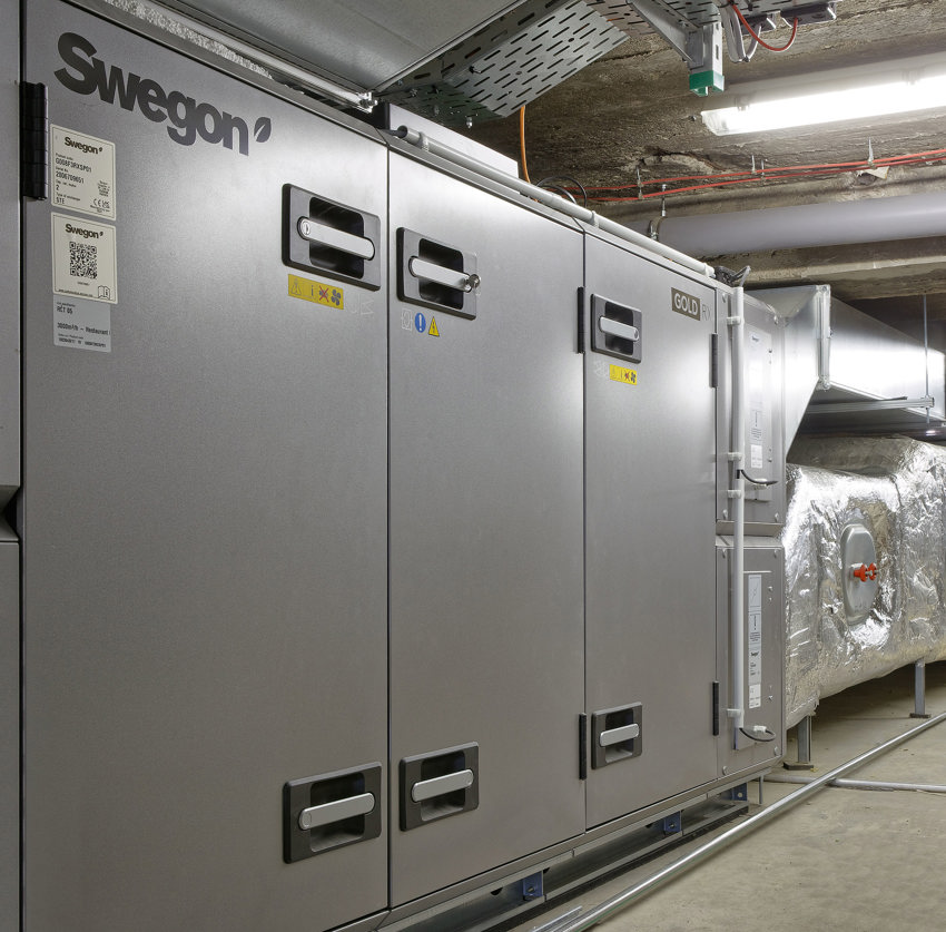 Auch die Lüftungsanlage für die Küche wurde mit einem neuen Lüftungsgerät ausgestattet. Hier war der Fokus ein anderer: Es sollte vor allem vermieden werden, dass Gerüche und Feuchtigkeit von der Abluft auf die Zuluft übertragen werden. Daher entschied man sich für ein GOLD SD-Gerät mit einem Luftvolumenstrom von 5.000 m3/h, bei dem die Zuluft und die Abluft vollkommen voneinander getrennt sind und jeweils über ein eigenes Register verfügen.