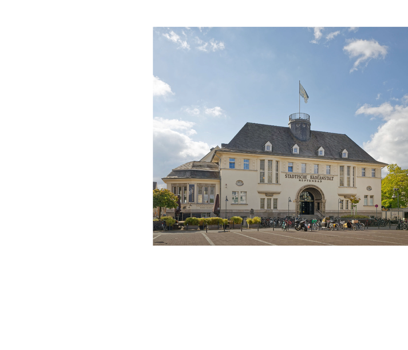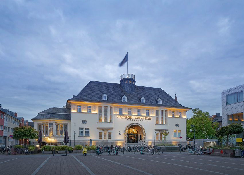 Mitten im Herzen von Köln gelegen, ist das Neptunbad ein wunderbarer Ort der Ruhe und Kraft. Ein historisches Kleinod in Ehrenfeld, das auf 5.000 m² alles bietet, vom Fitnessstudio bis zur Gastronomie: verschiedene Saunen, ein umfangreiches Fitnessangebot, ein Restaurant im Saunabereich, das Bar-Restaurant Badenbaden mit Biergarten und ein Tagungsraum im Jugendstil-Kuppelsaal – es ist an alles gedacht.