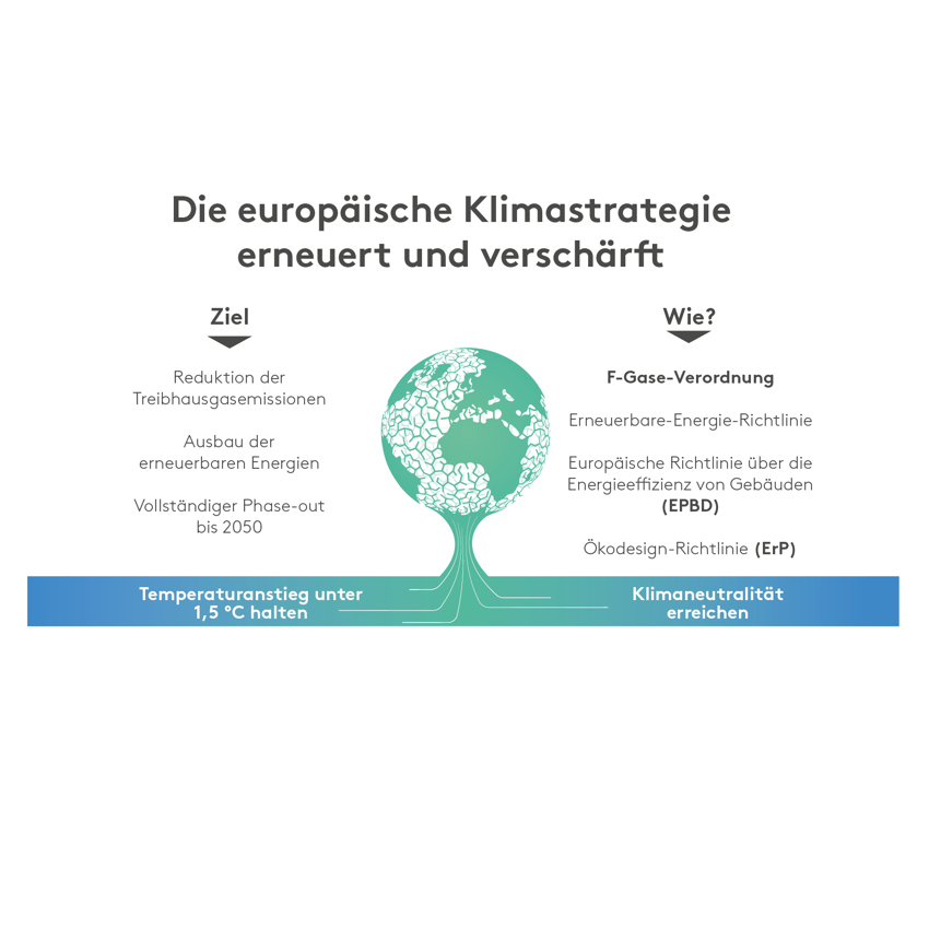Fluorierte und synthetische Kältemittel tragen zur Schädigung des Klimas bei. Global werden im Kampf gegen den Klimawandel Vorschriften verschärft und immer mehr synthetische Kältemittel verbannt. Durch die in Europa seit dem 11. Marz 2024 geltende neue F-Gase-Verordnung 2024/573 wurden die Weichen gestellt, um die Emission fluorierter Treibhausgase weiter zu reduzieren. Vorgesehen ist hier eine schrittweise Reduzierung der Verkaufsmengen von HFKW (in Tonnen CO2-Äquivalent), welche in einem Verbot 2050 endet. Dadurch gewinnen alternative Kältemittel mit niedrigem GWP (Global Warming Potential) weiter an Bedeutung. Dazu gehören natürliche Kältemittel wie CO2, Propan und NH3 sowie chemische Kältemittel wie Hydrofluorolefine (HFO), welche im Gegensatz zu natürlichen Kältemitteln in der Regel ohne größere Änderungen des Anlagendesigns auskommen.
