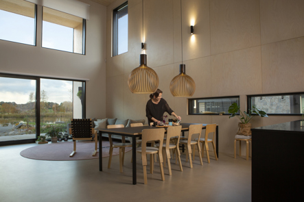 Kodin sisustuksessa on käytetty paljon erilaisia puupintoja, jotka luovat lämpimän tunnelman eri tiloihin. Sisustuksessa perhe arvostaa vanhan ja uuden yhdistämistä. ”Vanhat nettikirpparilöydöt ja uusi kotimainen design kulkevat tässä kodissa käsi kädessä”, kertovat talon omistajat. Yrittäjätaustainen perhe arvostaa myös paikallisuutta, joten rakennus- ja sisustustöissä on käytetty mahdollisimman paljon paikallisten yritysten palveluja ja tuotteita. Tästäkin syystä Swegon oli luonnollinen valinta. Swegon CASA -ilmanvaihtokoneet nimittäin valmistetaan Suomessa ja Turun kupeessa Kaarinan tehtaalla.
