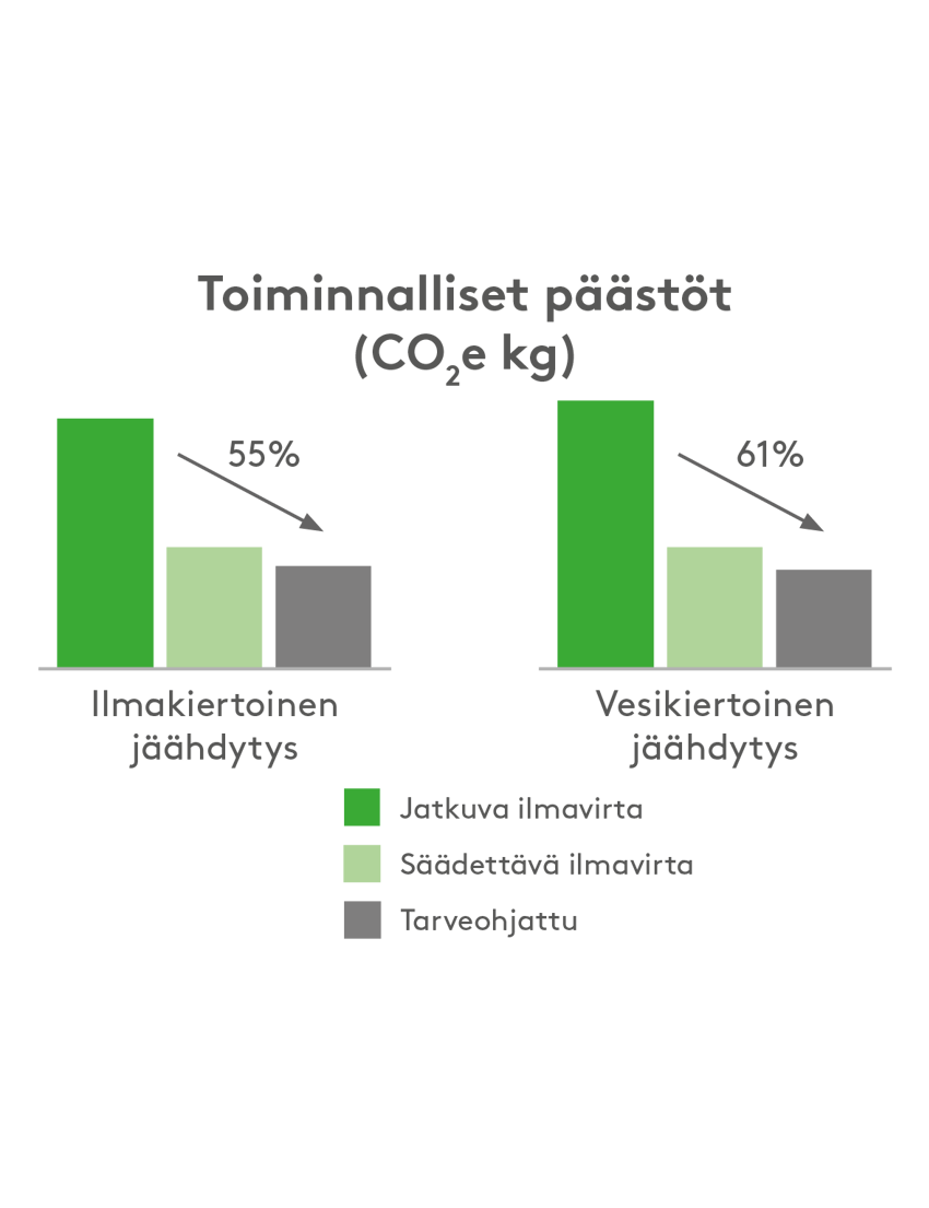 Pienempi energiankulutus merkitsee myös pienempää ilmastojalanjälkeä. Tarveohjatun ratkaisun avulla CO2-päästöjä voidaan vähentää jopa 61 %, mikä tekee siitä tehokkaan tavan edistää kestävämpää tulevaisuutta.