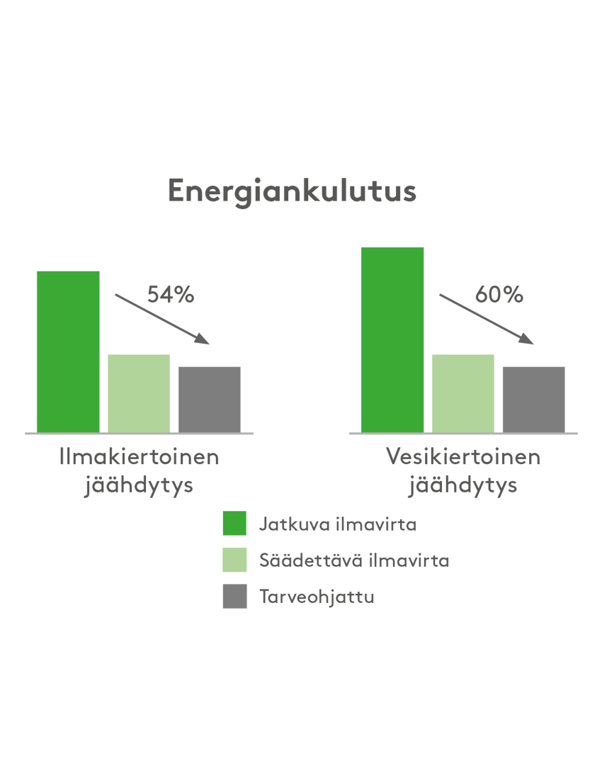 Tarveohjatun ilmanvaihtoratkaisun avulla voidaan saavuttaa merkittäviä energiasäästöjä. Itse asiassa energiankulutusta voidaan vähentää jopa 60 % järjestelmän suunnittelusta ja hallinnasta riippuen. 5 500 m2:n rakennuksen 60 %:n energiasäästö vastaa noin 245 000 SEK:n vuosisäästöjä (perustuen 1,77 SEK:n/kWh:n keskimääräiseen kustannussäästöön vuonna 2023).