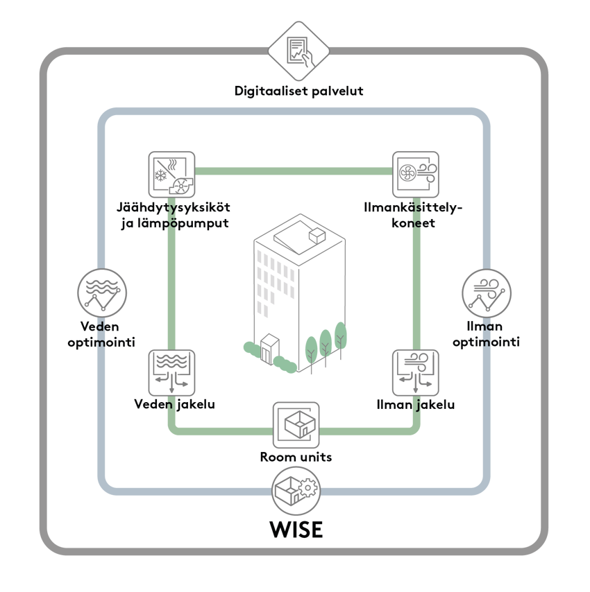 WISE sisältää aina peruspaketin, jolla saavutetaan tarveohjattu sisäilmasto. Peruspaketin lisäksi voidaan lisätä useita ratkaisuja, kuten visualisointi, optimointi, tiedonsiirto ja erilaiset toiminnot. Tämän lisäksi voidaan lisätä useita digitaalisia palveluja: