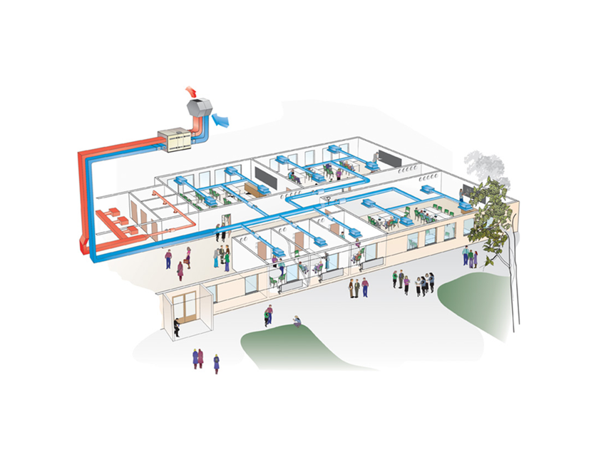 Dans les bâtiments existants, modifier les circuits est à la fois un défi et une opération coûteuse. Lorsque les besoins de refroidissement doivent être atteints alors que les circuits existants ne permettent pas de transporter des débits d’air suffisamment élevés, la solution consiste à installer un système de climatisation à induction par eau. Dans les situations nécessitant potentiellement des débits d’air élevés ou moyens et variables, un refroidissement à induction par air est la solution idéale : Salles de conférence, magasins, salles de cours, restaurants, industries légères, salles blanches dans les hôpitaux et les industries spécialisées, centres commerciaux et centres sportifs.