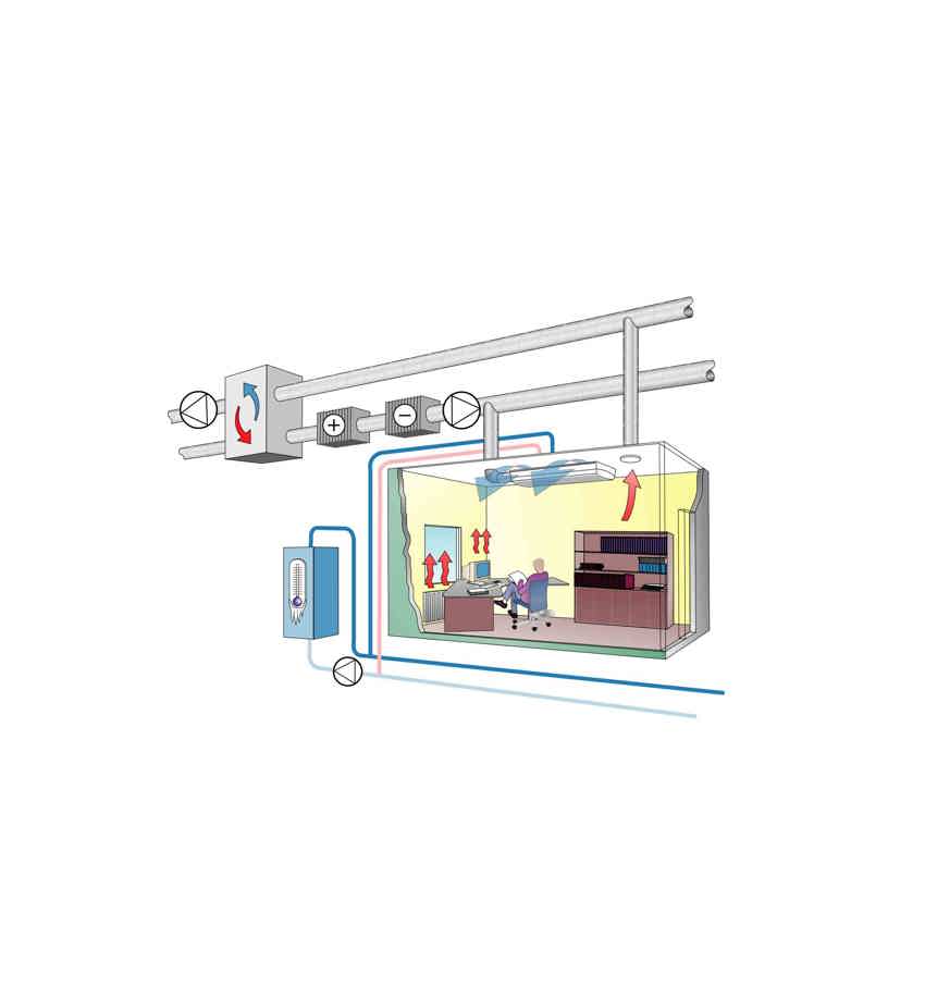Avec cette solution, les pièces sont refroidies individuellement par un système à induction par eau. Le système à induction par air existant est dans ce cas uniquement utilisé pour atteindre des critères de qualité d’air. Dans le cas d’une conversion ou d’une rénovation, un système de climatisation à induction par eau est généralement préférable étant donné qu’il est relativement facile d’installer les circuits de distribution d’eau froide dans le bâtiment. Les systèmes de climatisation à induction par eau peuvent également être indiqués dans les constructions neuves vu qu’ils prennent moins de place dans le faux plafond qu’un système à induction par air. Dans certains bâtiments très hauts, cela peut même permettre de « gagner» des étages supplémentaires.