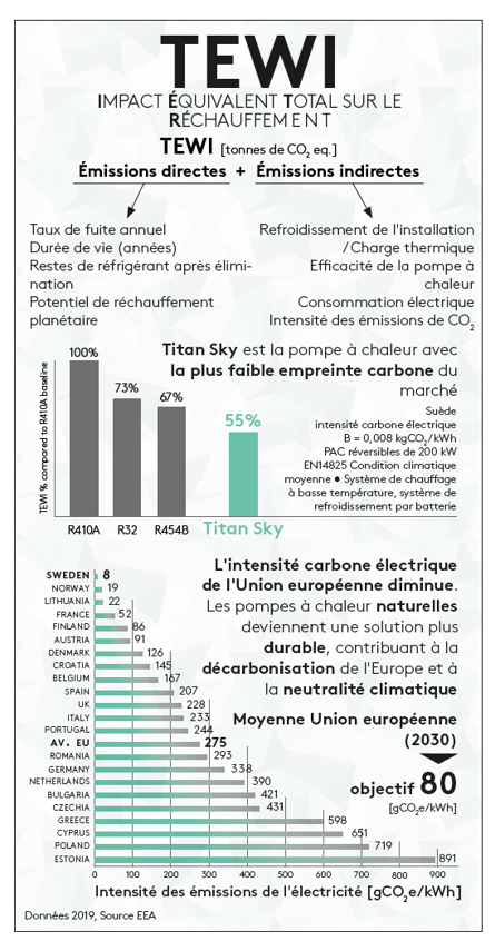 Titan Sky offre un rendement saisonnier (SCOP) très élevé grâce à l'utilisation de la technologie Inverter combinée à l'utilisation du gaz naturel Propane-R290. Chez Swegon, nous en sommes particulièrement fiers de cette machine car elle établit une nouvelle référence en termes de TEWI (Total Equivalent Warming Impact), celui-ci étant le plus bas sur le marché des pompes à chaleur destinées à des applications tertiaires. Et bien entendu, cette unité est certifiée Eurovent.