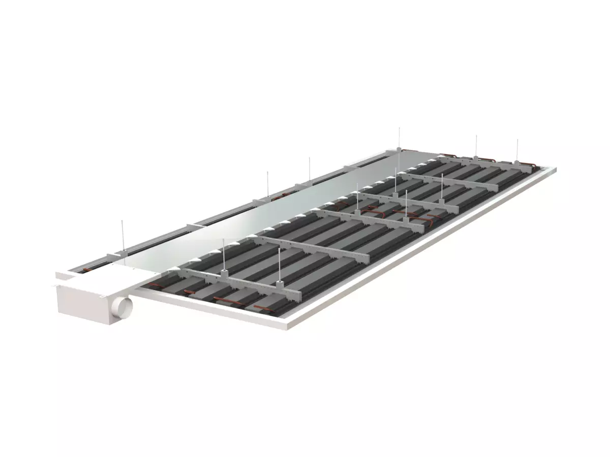 L’îlot rayonnant textile VARICOOL TKM, combiné au système hybride CAURUS, assure un climat intérieur optimal dans tous les espaces. Cette combinaison offre un très haut niveau de puissance calorifique et frigorifique, un flux d’air pulsé confortable et d’excellentes propriétés acoustiques. De plus, selon le principe du système d’éléments de construction thermoactifs, ce système intègre la masse de stockage pour la dissipation des charges thermiques dans le concept thermique global du local. Il en résulte une nouvelle baisse des besoins en énergie et des coûts d’exploitation. VARICOOL TKM est réalisable comme plafond îlot ou comme fermé.