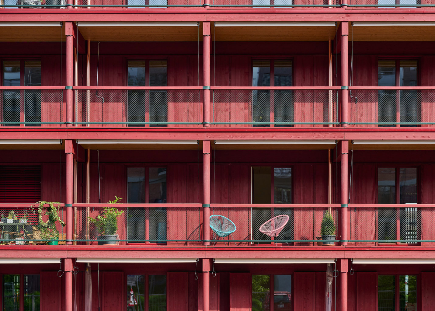 L'accès pergola aux appartements favorise les contacts sociaux. L'architecture en bois forme le cadre de vie expressif mais calme qui convient à la norme. Du sol au plafond, tout simplement magnifiques, les fenêtres en bois à double battant permettent à la lumière et à la chaleur d'inonder le sol, mais permettent également le recul nécessaire dans ce contexte urbain. Des plantes en pot, des hamacs et des meubles animent l'architecture de la véranda et confèrent à la forme légèreté, convivialité et confort.