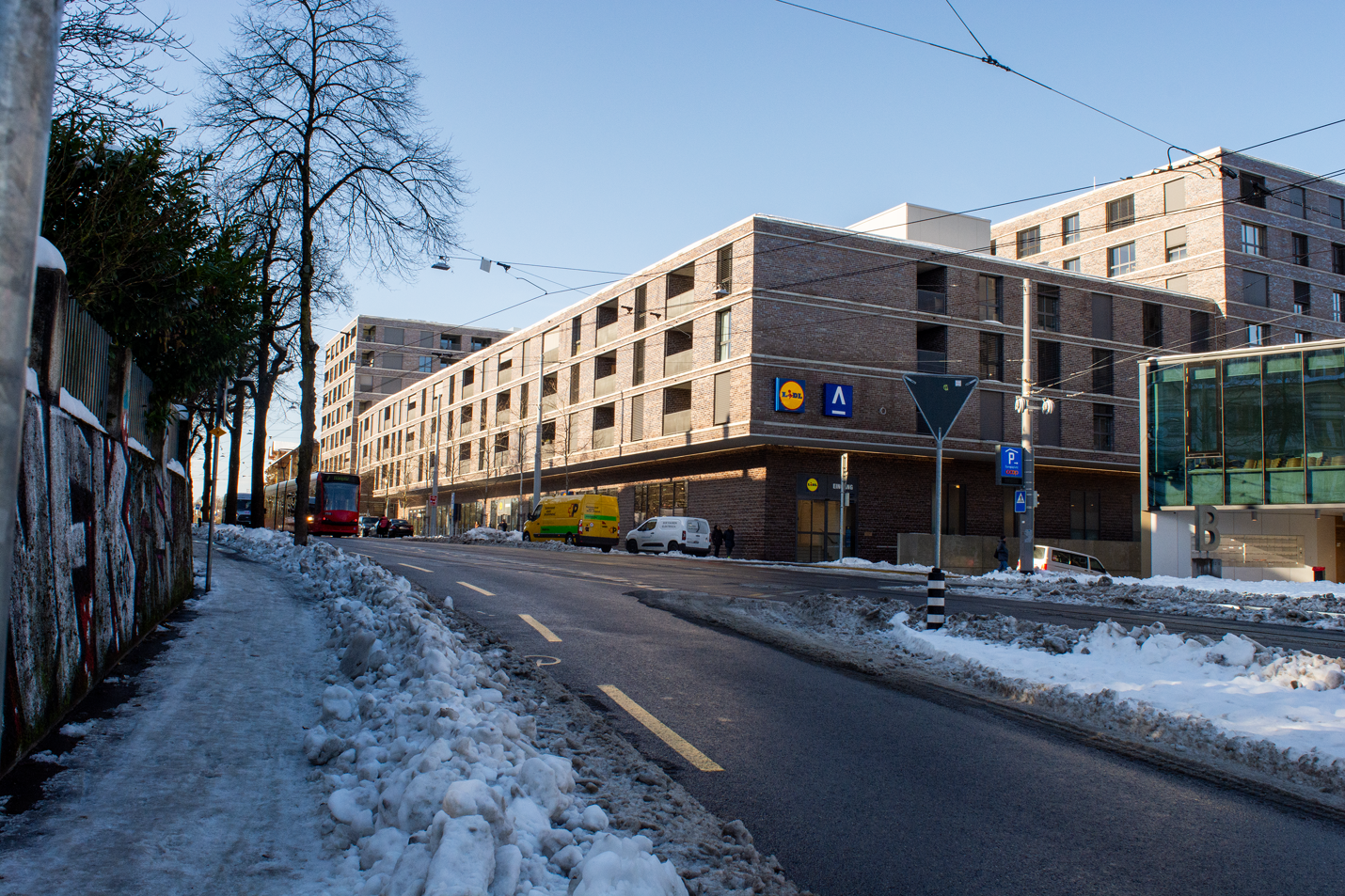 Aux étages supérieurs, environ 9’000 m² de logements de qualité ont été créés, comprenant 178 appartements et deux ateliers. La conception des studios ainsi que des appartements de 2,5 et 3,5 pièces repose sur un plan ouvert selon le principe de traversée. Les sous-sols abritent des locaux pour vélos et des places de stationnement pour voitures.