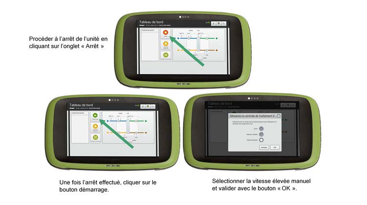 Lors des épisodes épidémiques, il convient de modifier la programmation horaire en fixant un démarrage à la vitesse nominale au moins 2 heures avant la durée d’utilisation du bâtiment et passer à une vitesse inférieure au moins 2 heures après la fin de durée d’utilisation du bâtiment.