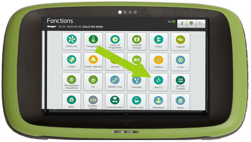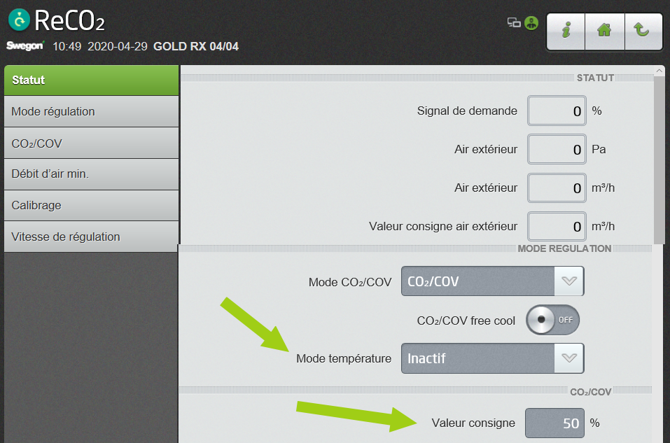 Selon le guide REHVA COVID-19, du 3 Avril 2020, la consigne de CO2 doit être inférieure à 400 ppm. Les sondes CO2 des unités GOLD ont une plage de fonctionnement de 500 – 1500 ppm. En réglant la consigne qui est exprimée en pourcentage à 0% de CO2, la machine sera verrouillée en tout air neuf.