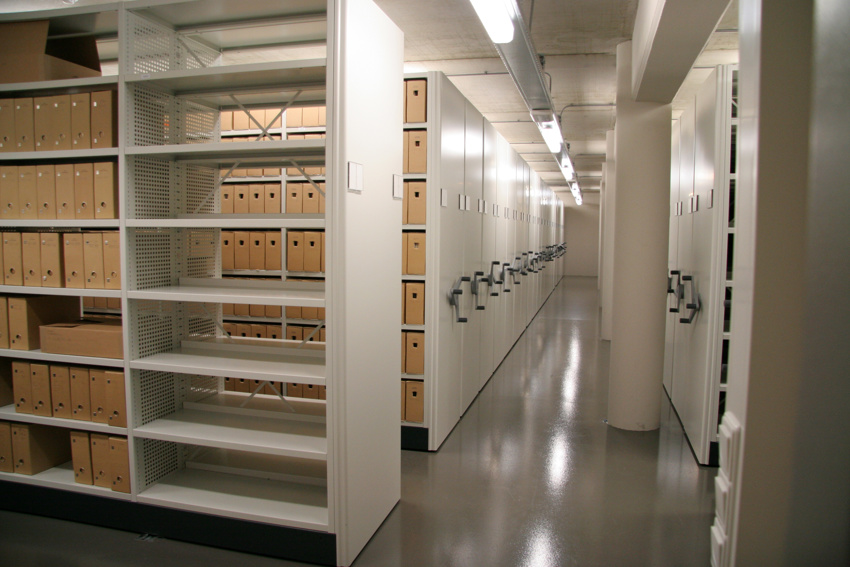 • Les magasins d'archives, vastes pièces équipées d'étagères où sont entreposés les documents de petit format (jusqu'au format A4).