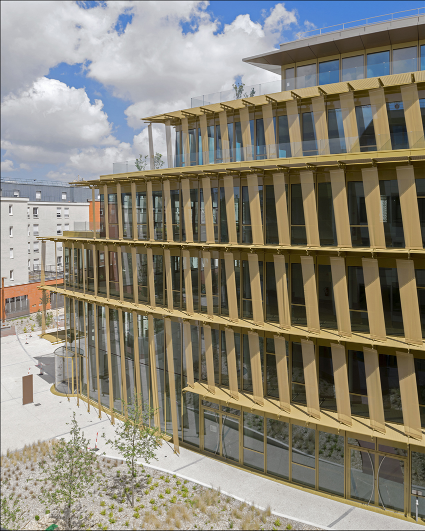 Ce qui caractérise le plus ce bâtiment, ce sont ses grandes façades vitrées au Sud et à l’Ouest, dotées de brise-soleil en toile, qui permettent de baigner les différents espaces de lumière naturelle. Au Nord, les façades pleines, percées d’ouvertures, ont été réalisées en fonction des besoins d’éclairement naturel des locaux, tout en offrant une inertie limitant la consommation énergétique.