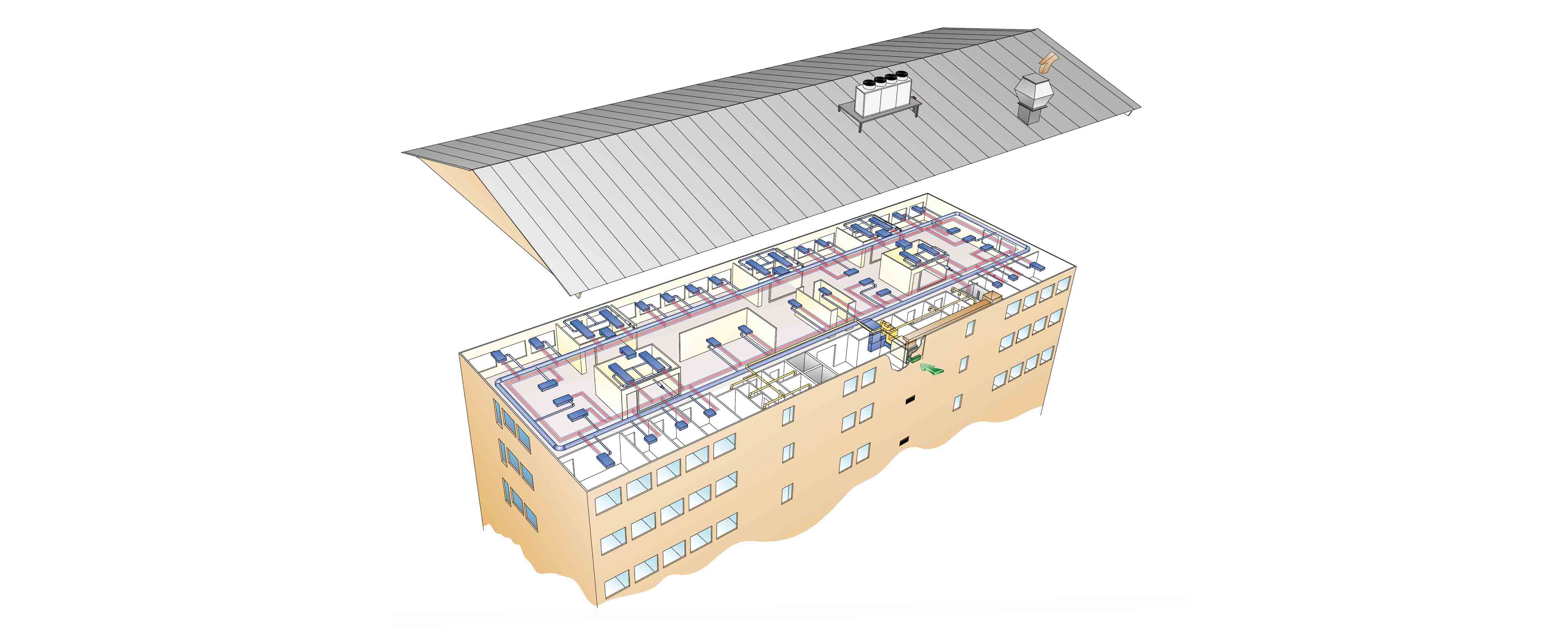 A multistorey office block can be sized so that each storey has its own air conditioning system to cater for air quality and room climate needs. The air handling unit delivers precisely the right volume of air by means of pressure regulation via a communications unit. A feature that controls the primary water circuit optimises the temperature of the water used for cooling and heating. Room-controlled comfort modules then guarantee the desired temperature in each interior.