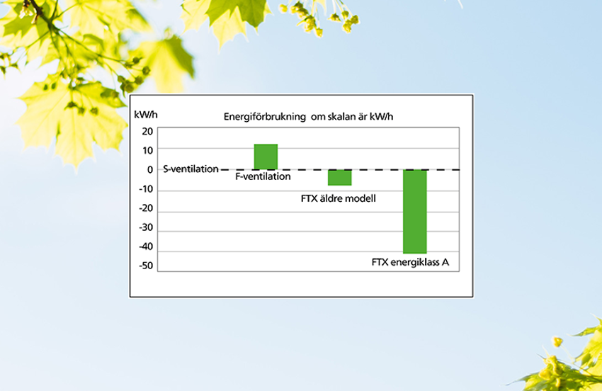 Med et FTX-aggregat i energiklasse A sparer du 40 kWh/m² per år. Har du et hus på 160 m² med selvtrekksventilasjon, så tilsvarer besparelsen med et FTX i energiklasse A 6400 kWh per år ifølge beregningsmodellen i Ecodesign-direktivet.
