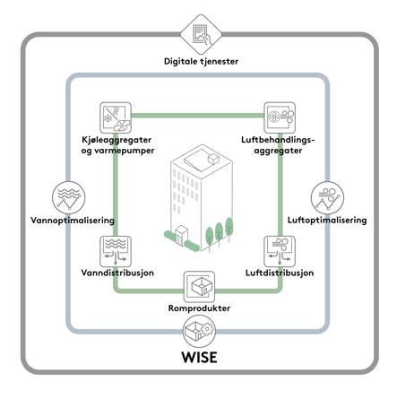 Ved hjelp av WISE er det i prinsippet mulig å styre alle elementene i et klimasystem, som luftbehandlingsaggregater og klimaprodukter. I tillegg kan WISE styre vann- og luftoptimalisering. Det er også mulig å legge til digitale tjenester, der data om produkter og eiendommer kan visualiseres og styres.