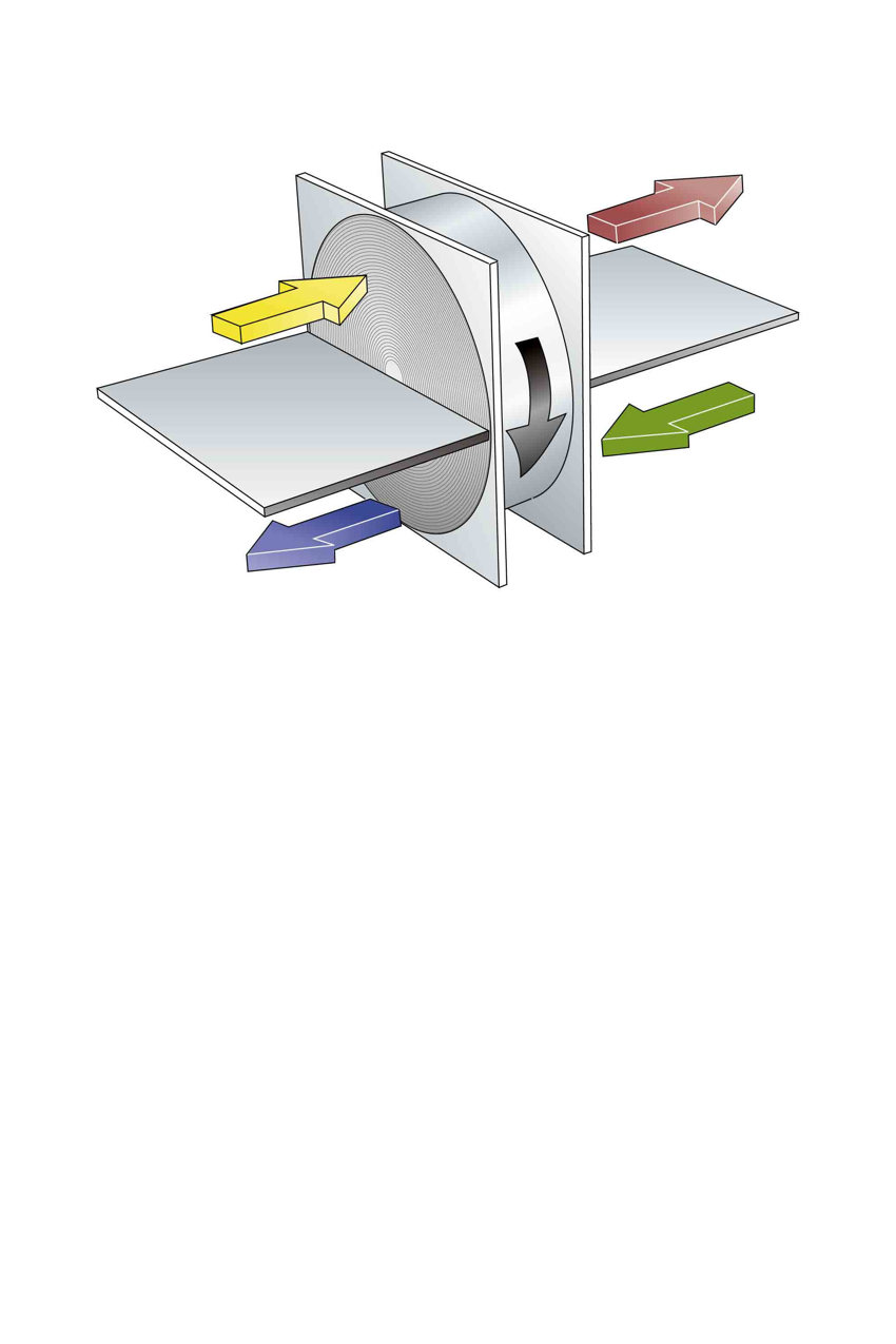 Rotacyjny wymiennik ciepła składa się z koła obrotowego wykonanego z aluminium montowanego w sekcji. Jedna połowa sekcji pracuje w strudze powietrza nawiewanego, a druga w strudze powietrza wywiewanego. Strukturę wymiennika tworzy wiele aluminiowych kanalików, umieszczonych równolegle do przepływu powietrza. W trakcie pracy centrali wymiennik wprawiany jest w ruch obrotowy. Cieplejsze powietrze wywiewane podgrzewa aluminiowe kanaliki i przenosi ciepło do chłodniejszego powietrza nawiewanego. Chłodniejsze powietrze nawiewane przepływając przez ciepłe kanaliki aluminiowe ogrzewa się.