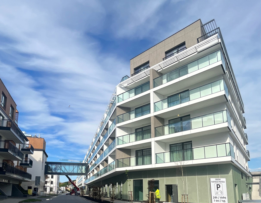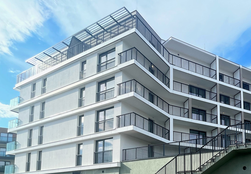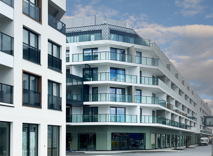 W pierwszym etapie oddany zostanie do użytku reprezentacyjny, pięciopiętrowy apartamentowiec, którego trzy części układają się na planie litery U.