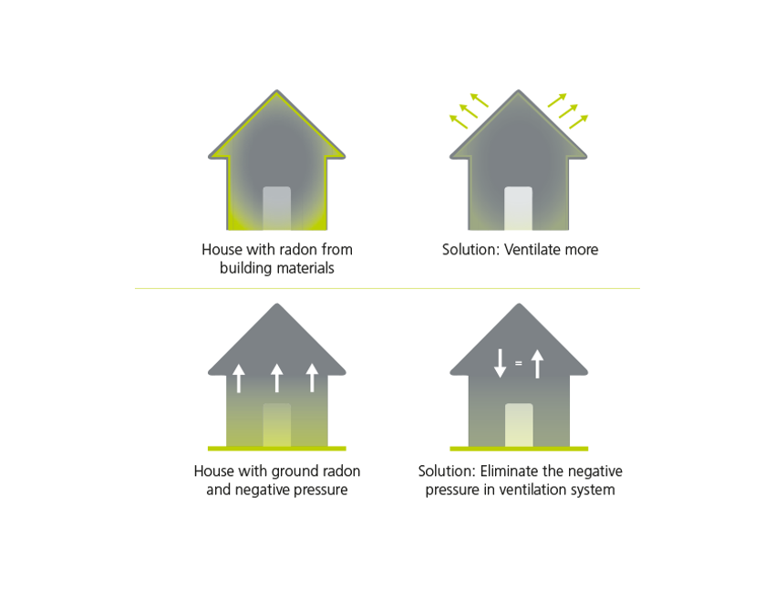 For protection against ground radon, you need a balanced ventilation system, meaning the same amount of mechanical supply air as extract air. If there is negative pressure, the risk is that the radon will be ‘sucked’ into the building through cracks in the foundation. The solution for most homes is to install an air-to-air heat exchange ventilation system for venting spent, radon-contaminated air.