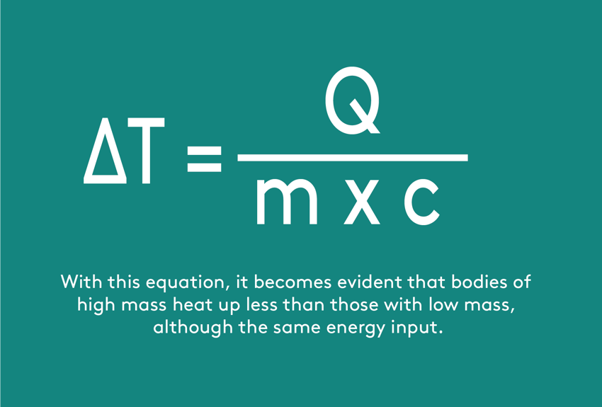 So, all bodies have thermal inertia, or heat capacity. In addition to the thermal coefficient* (c) of each substance, or mixture of substances, the degree of conversion of energy (Q) into heat (T) is also composed of the mass (m) of a body. With the equation at hand, it becomes evident that bodies of high mass heat up less than those with low mass, although the same energy input.