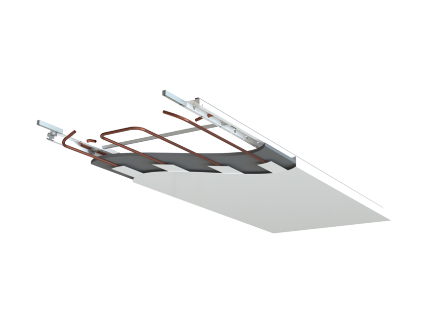 Mass connection via water pipes is when a product is in direct connection with the concrete ceiling. This by the means of its water pipes. This method allows for the concrete to be cooled or heated efficiently, thanks to the direct connection between pipes and concrete. The adverse effect of this method is the cooling capacity of the product, since it is mounted directly on the ceiling it does not allow for the room air to come in contact with the concrete which otherwise can allow for additional cooling.