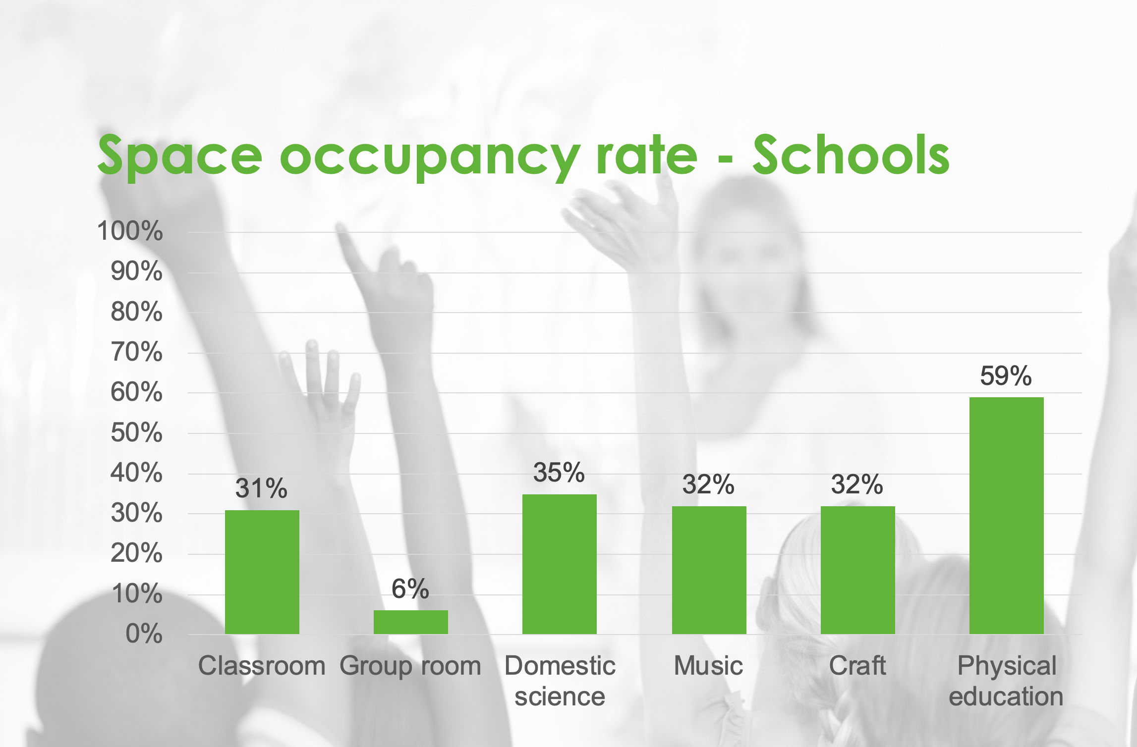 Schools are among the building applications with the most distinct changes in occupancy and activity. This guide will later show that utilisation of class rooms are usually as low as 30-35%. However, other building applications, for instance offices and hotels, are facing variable requirements for ventilation, heating and cooling as well. These might also be facing even further changing requirements in the indoor climate since hybrid working models and longer hotel stays are expected as we go forward.