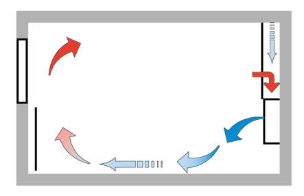 If diffusers with a flexible distribution pattern are used, a temperature difference between the room air and supply air of max 6°C may be applied in this method. Maximal cooling load is about 35 W/m2 at ceiling heights of approximately 2.8 m.