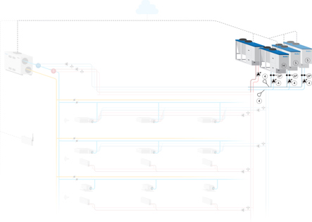 Hyzer provides complete control over hydronic systems featuring multiple units, variable flow management, integrated or centralized pumps, and auxiliary energy sources.