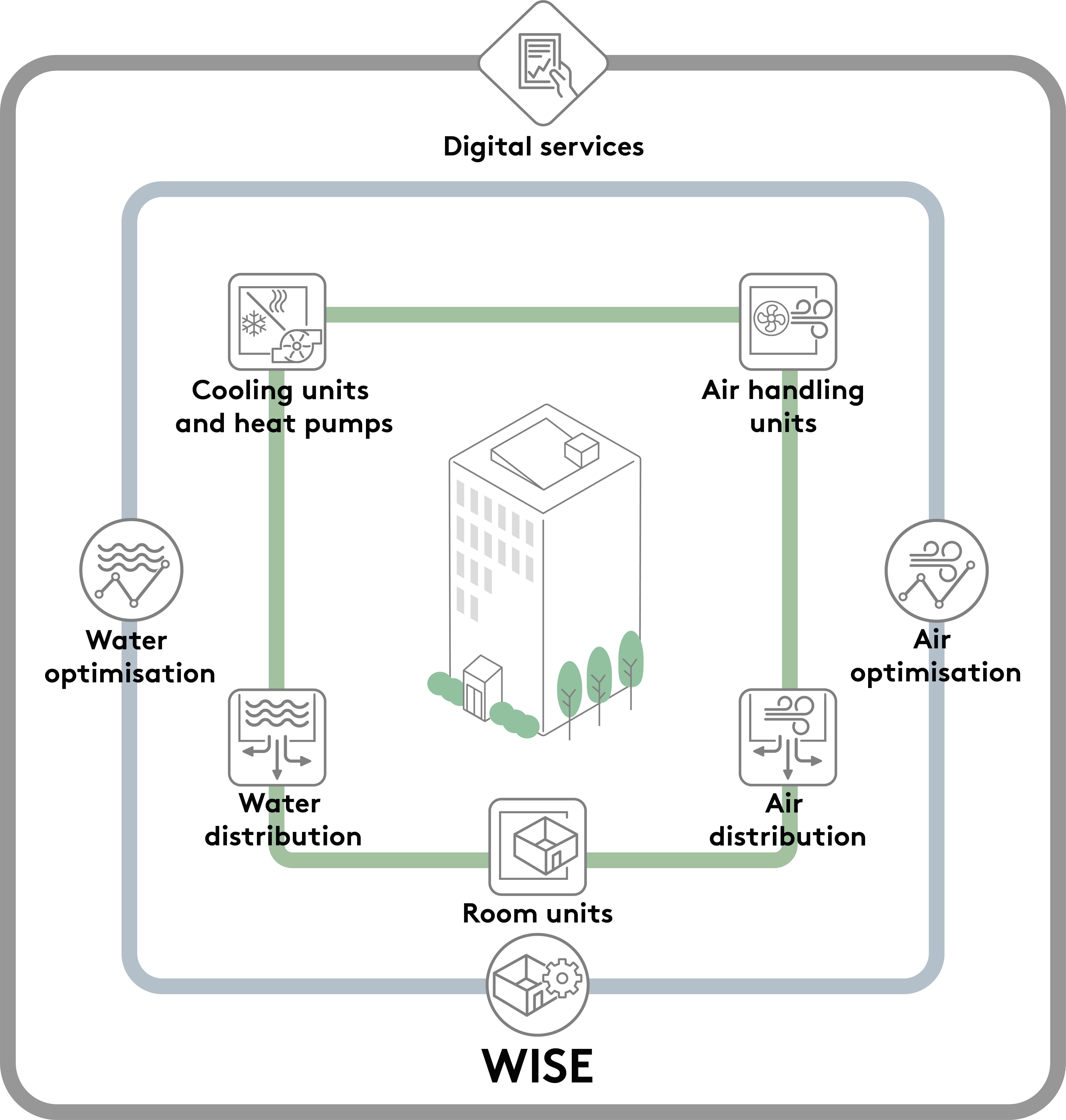 Using WISE, it is basically possible to control all the elements in a climate system, such as air handling units and climate products. In addition, WISE can also control water and air optimisation. Furthermore, it is possible to add digital services in which products’ and properties’ data can be visualised and managed.