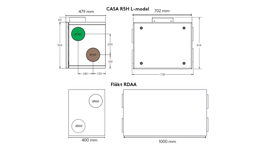 Den övre bilden visar måtten på Swegon CASA R5-H.