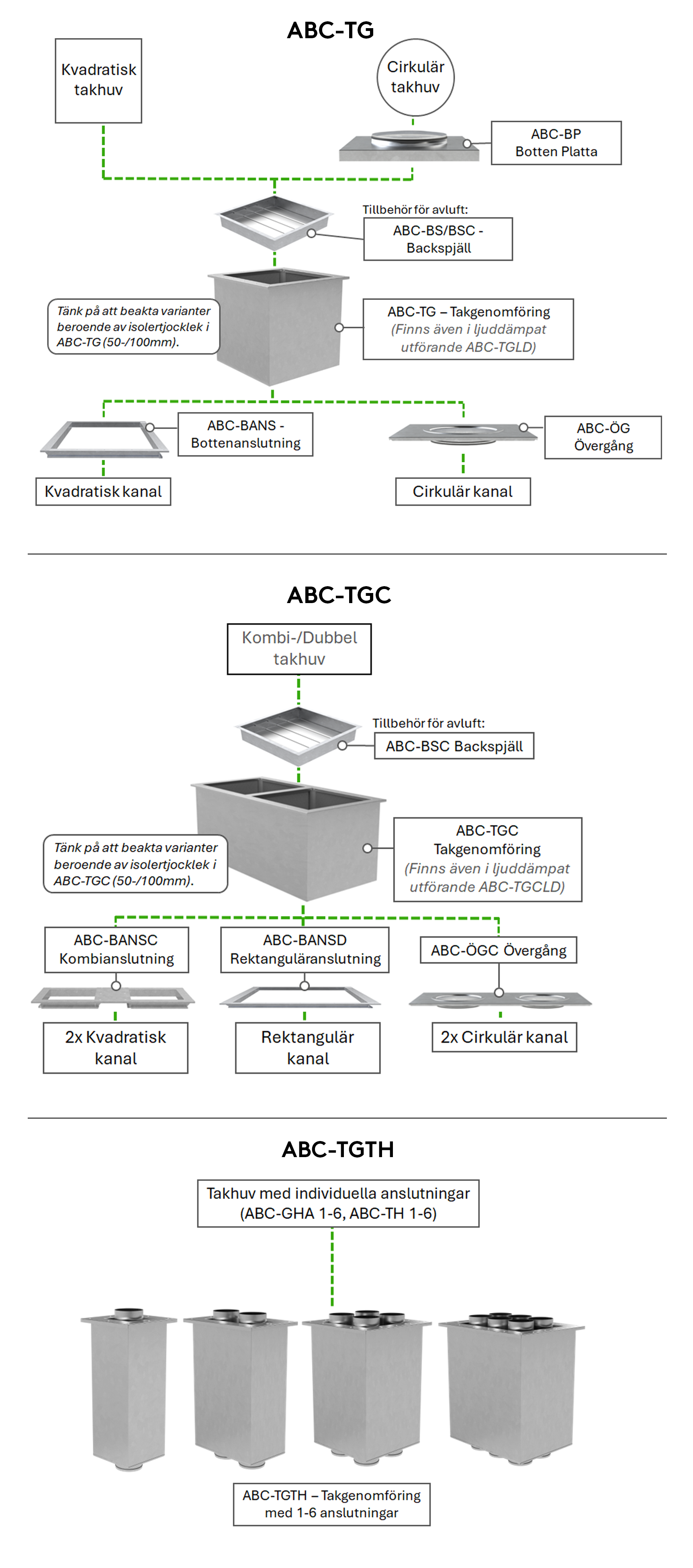 Takgenomföringar används för att skapa en tät och säker anslutning genom yttertaket mellan kanalsystemet och takhuven. För bästa slutresultat anpassas takgenomföringar vid projektering till rätt längd med hänsyn till bjälklagskonstruktion, storlek på genomföring och aktuell taklutning. Takgenomföringar avslutas minst 300 mm ovanför yttertakets färdiga ytskikt. I vårt sortiment hittar du flera varianter av takgenomföringar med tillbehör. Nedanstående bild visar hur ABC-TG (takgenomföring för enkelhuvar) och ABC-TGC (takgenomföring för dubbel- och kombihuvar) kan kompletteras med tillbehör.