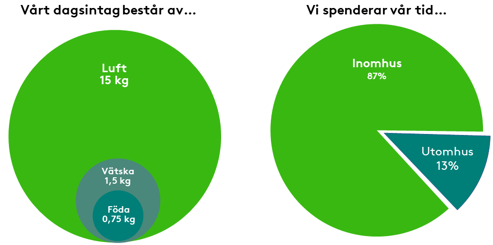 När man ser diagrammen är det lätt att inse att våra inomhusmiljöer spelar en stor roll för oss – i ett modernt samhälle spenderar vi en stor del av vår tid i en miljö som är kontrollerad och frånkopplad naturens variationer. Skönt när det stormar och hällregnar ute, men det ställer också krav på att inomhusmiljön håller en hög nivå som passar oss som levande varelser. Vi är också noga med vad vi konsumerar i form av vätska och föda, för att hålla oss produktiva och hälsosamma, men vi funderar sällan på all den luft vi konsumerar med varje andetag.